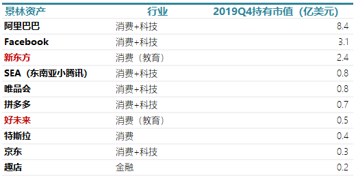 我们也分别研究了高领资本与景林资产的美股前十大持仓,重仓消费,尤其是新兴消费,包括电商、教育、文化等;
